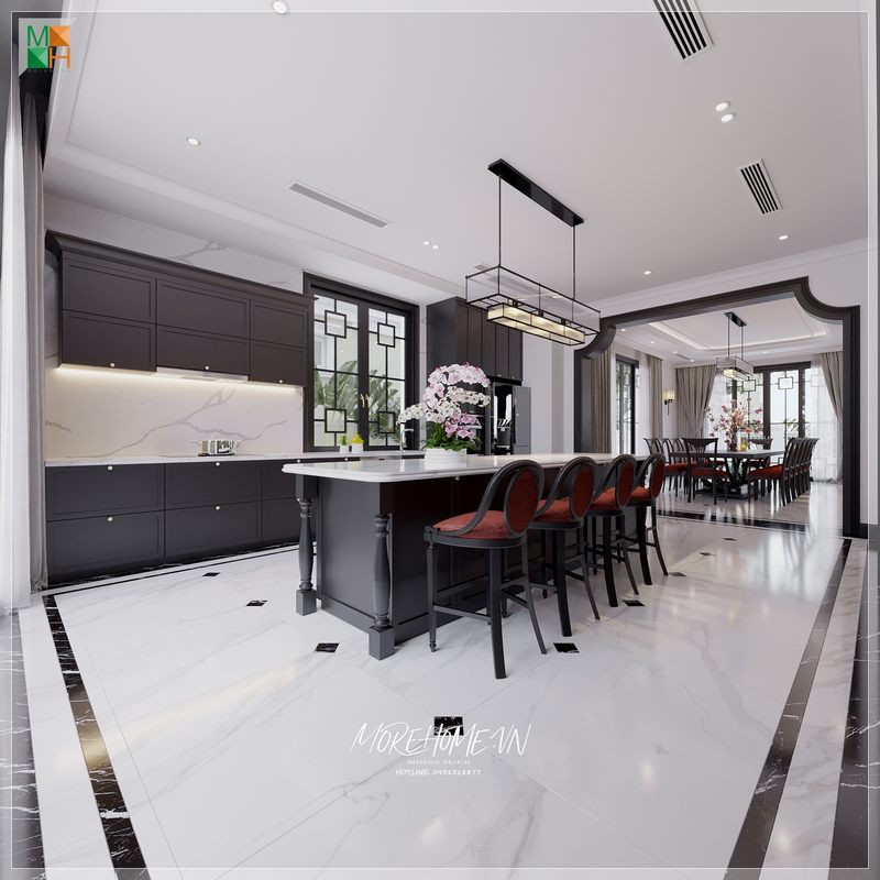 Thiết kế phòng bếp - ăn màu trắng theo phong cách tân cổ điển tương phản với đá ốp tường bếp màu đen huyền bí là lựa chọn hoàn hảo cho cả biệt thự, nhà phố, chung cư cao cấp.